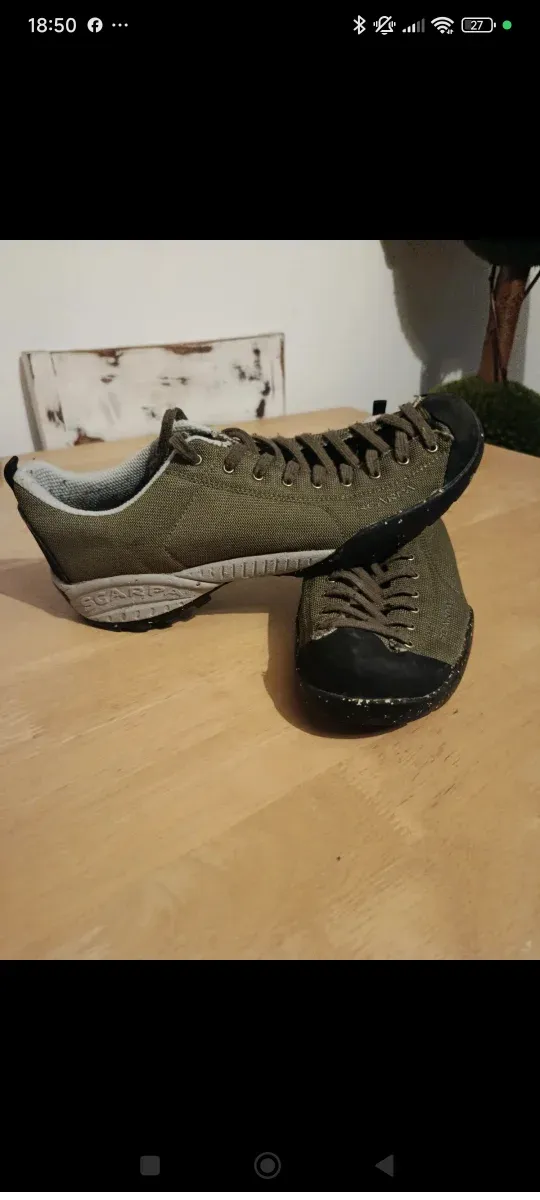 Zapatillas de la marca SCARPA, modelo MOJITO.Talla 45 - Color verde militar. - Material exterior de lona. - Suela de goma. - Cierre con cordones.