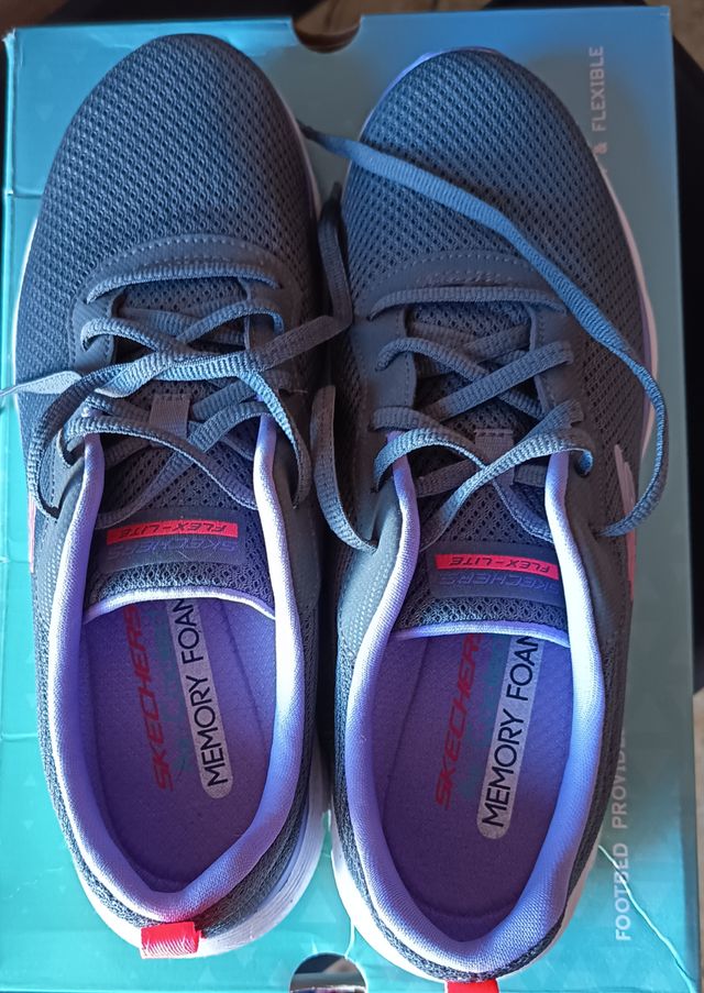 Como nuevo · 39 · Skechers · Gris y Morado