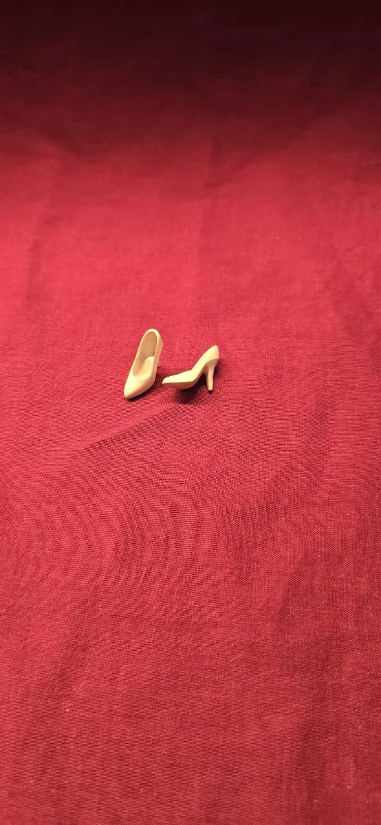 Par de zapatos de tacón para muñeca Barbie de los años 80. Son de color blanco y tienen un diseño clásico. - Zapatos de tacón. - Color blanco. - Estilo años 80.