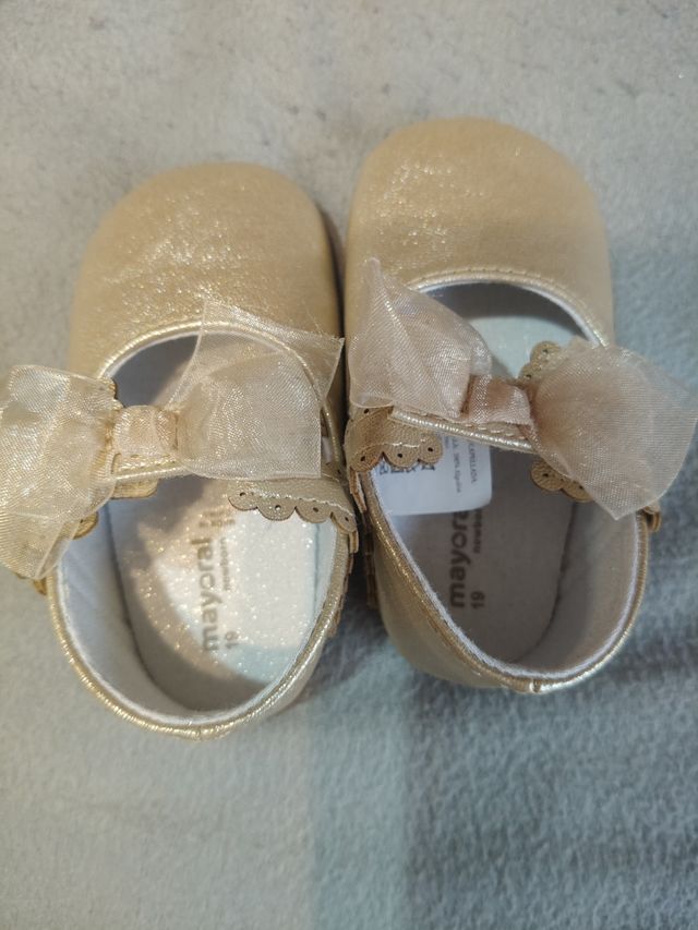 Vendo zapatos de bebe, talla 19 dorados, de mayoral, puestos solo 1 vez