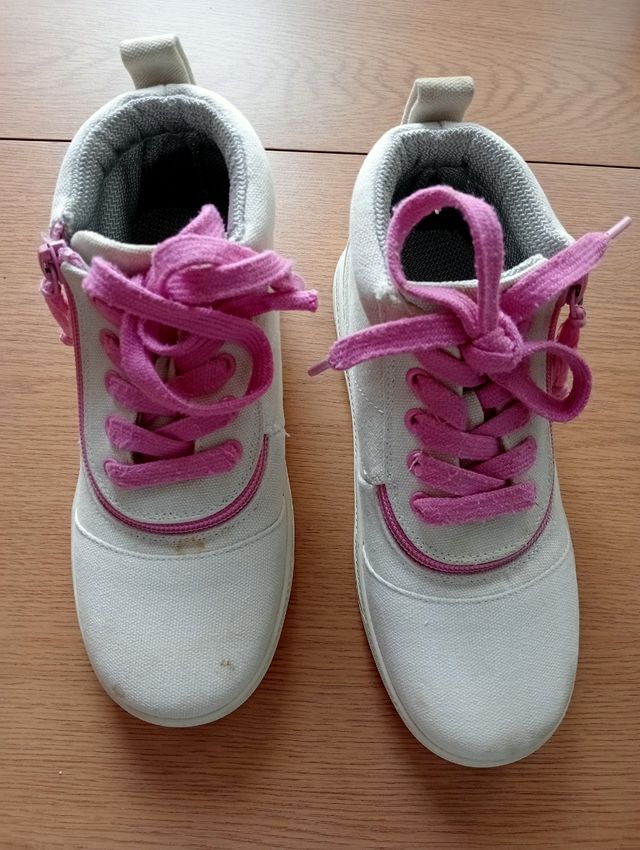 Detalles del productoZapatos de lona blancos con cordones rosas y cremallera lateral. Tienes roces por encima que necesitarían crema pero la suela y el interior están nuevos.