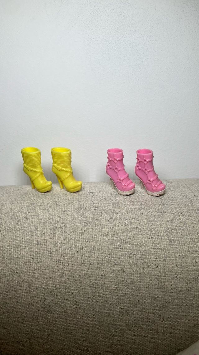 Lote de dos pares de zapatos para muñecas Bratz. - Un par de botas amarillas con detalles plateados. - Un par de botas rosas con plataforma y detalles plateados.