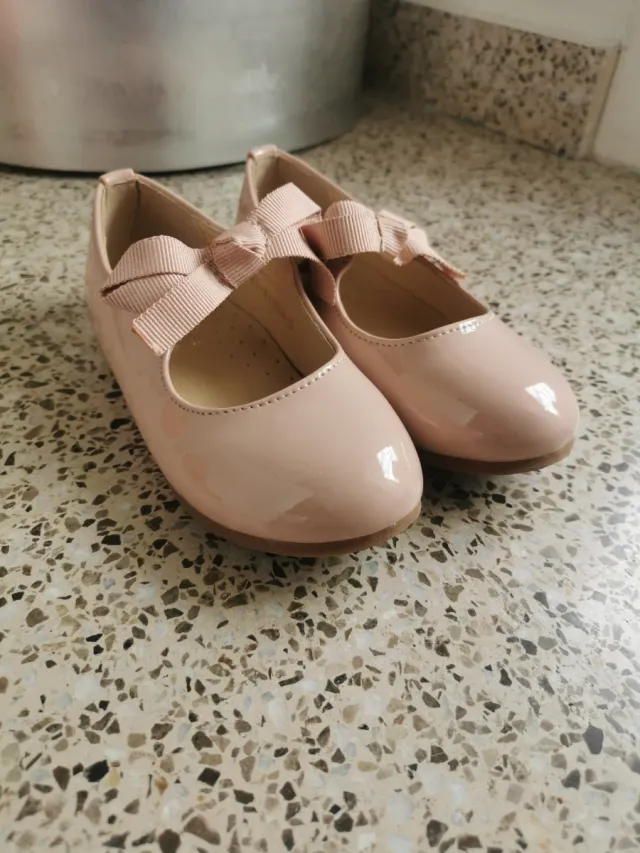 Preciosos zapatos de charol para niña en talla 28. Tienen un diseño elegante con un lazo. - Color rosa pálido. - Cierre de tira. - Suela de goma.