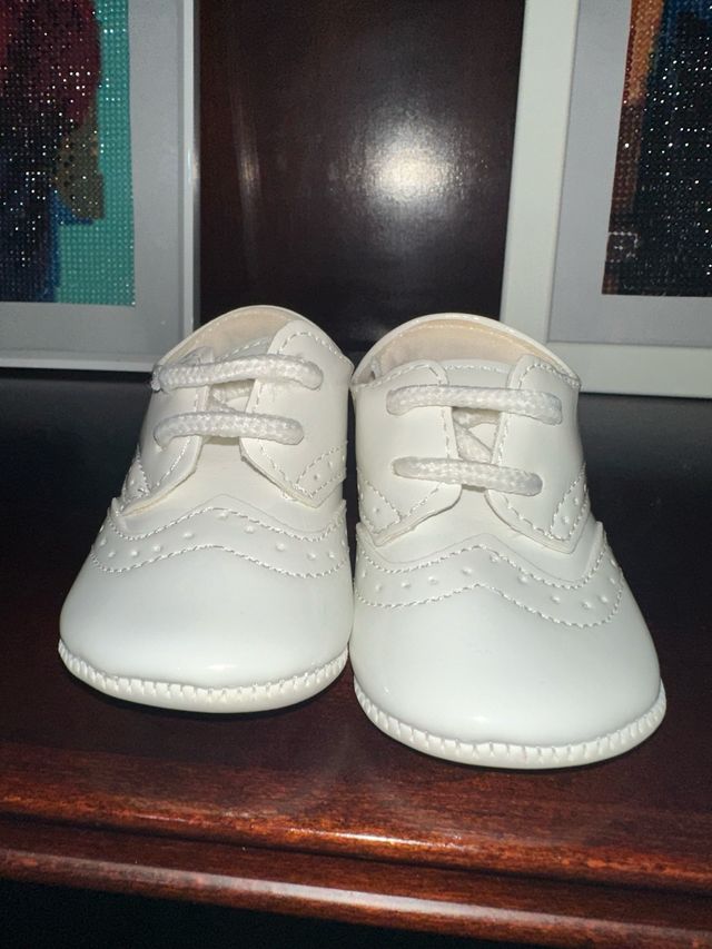 Preciosos zapatos de bebé en color blanco, perfectos para ocasiones especiales. - Diseño clásico con cordones. - Detalle de picado en la puntera.