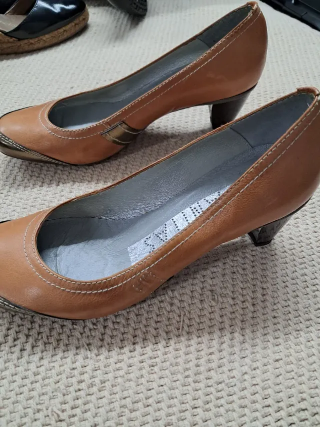 Elegantes zapatos de piel en un bonito color teja. Talla 36 - Material exterior de piel. - Diseño de tacón. - Detalle metálico en la punta y el lateral.