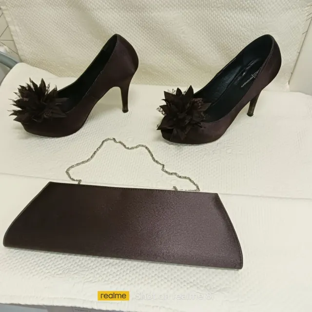 Zapatos de raso marrón Talla 37 Con bolso a juego.