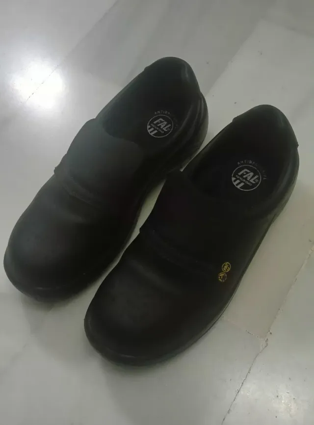 Par de zapatos de seguridad laboral de la marca FAL. - Color negro. - Diseño antideslizante. - Antibacterianos.