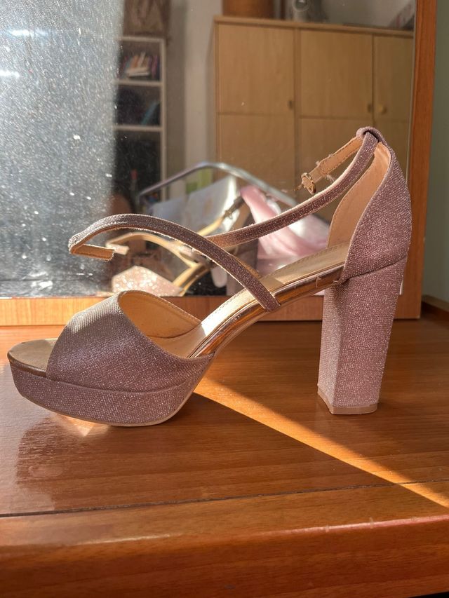 Elegantes zapatos de tacón con un acabado brillante. - Tacón grueso y plataforma. - Tira al tobillo con cierre de hebilla. - Diseño abierto en la punta.