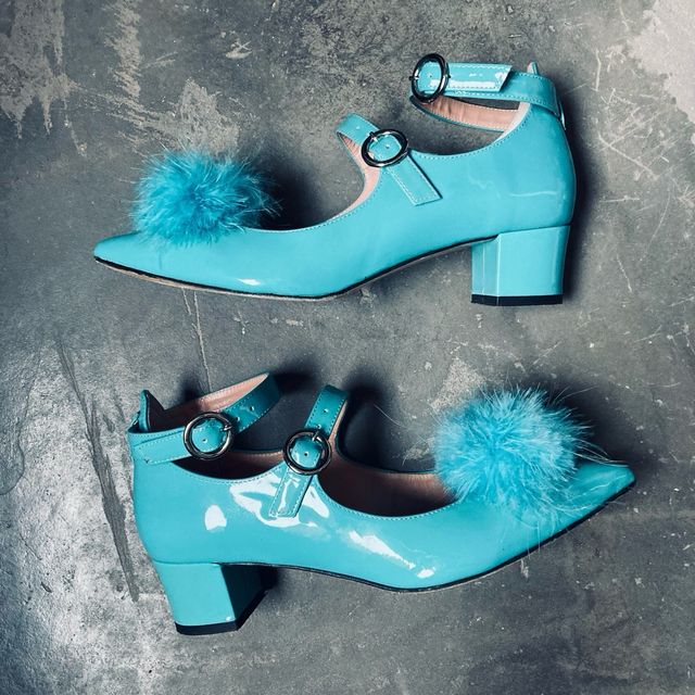 Detalles del productoZapatos de charol con tacon medio en coor azul turquesa. Cierre con soble pulsera, una de ellas al tobillo. Detalle de plumas de marabu. Puestos solo en una ocasion. Ipecables!!