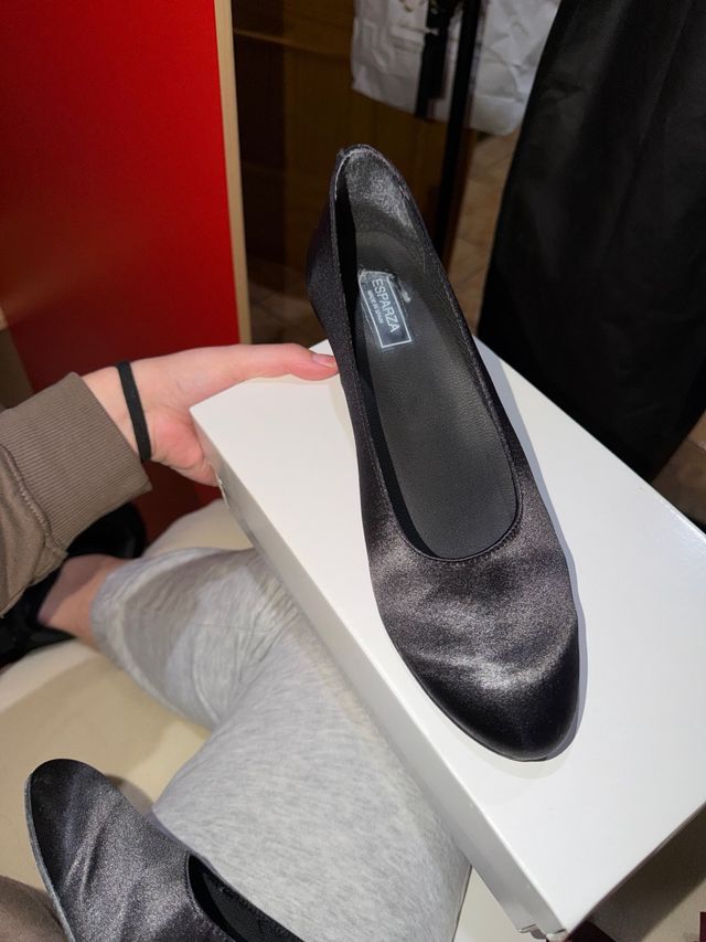 Elegantes zapatos de tacón de la marca Esparza. - Color negro. - Diseño tipo fallera o bailarina. Tallan pequeños
