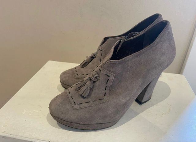 Zapatos de tacón grises con flecos