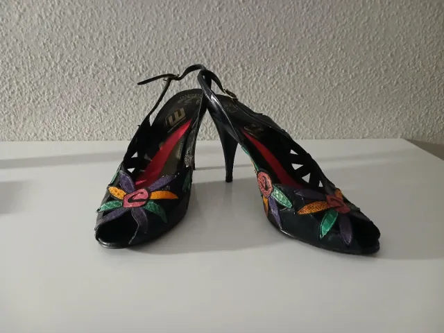 Elegantes zapatos de tacón negros con un diseño abierto en la punta y detalle de flores multicolor.