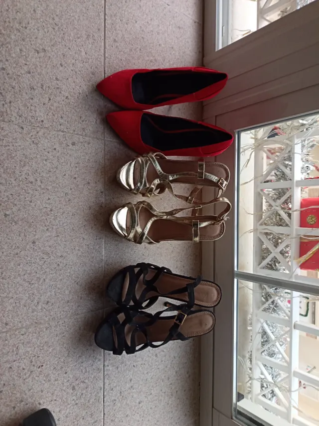 Zapatos de tacón negros, dorados y rojos