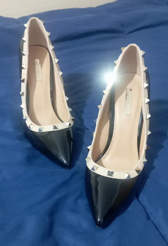 Zapatos de tacón negros y beige con tachuelas