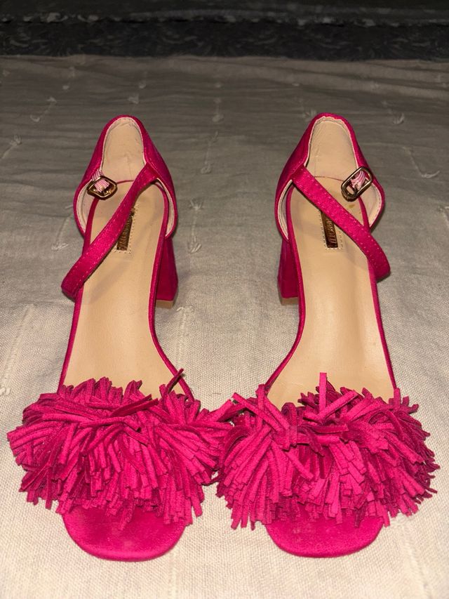 Zapatos de tacón rosa con flecos