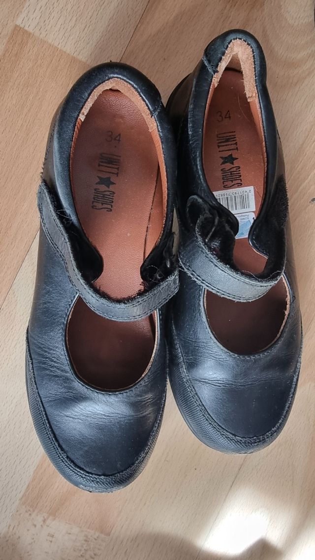 Zapatos negros de estilo escolar, talla 34. - Cierre de velcro. - Suela de goma. - Marca: UNIT SHOES. Desgastados por el uso. Tiene marcas de uso