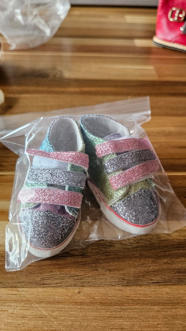 Detalles del productoAdorable par de zapatos para muñecas con un diseño brillante y colorido. Suela 7,8 cm