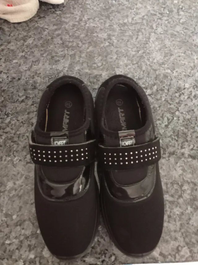 Zapatos negros de la marca Bambo, perfectos para el día a día. - Cierre de velcro. - Detalle de tachuelas en la tira. - Acabado brillante en la puntera.