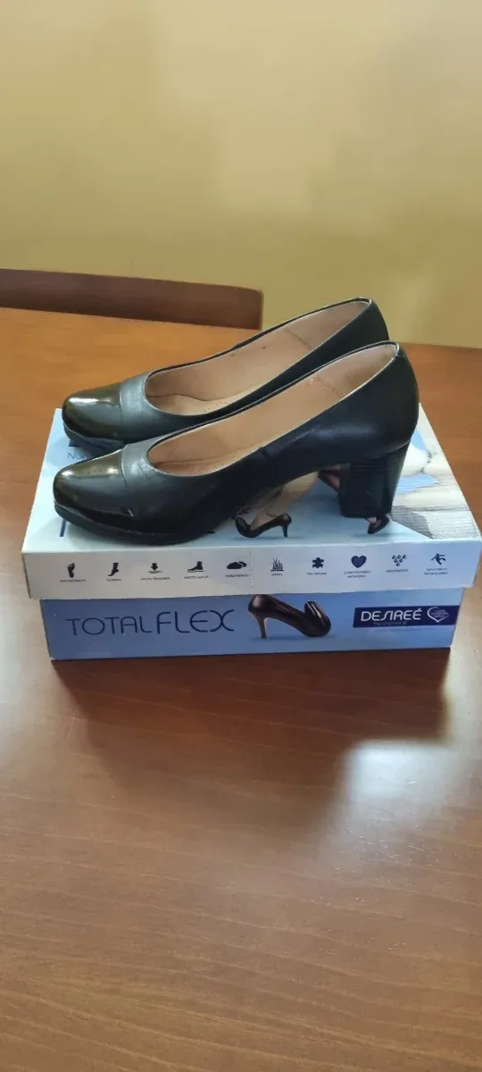 Elegantes zapatos negros de tacón, talla 37. - Diseño clásico y versátil. - Tacón grueso para mayor comodidad. - Material exterior brillante.