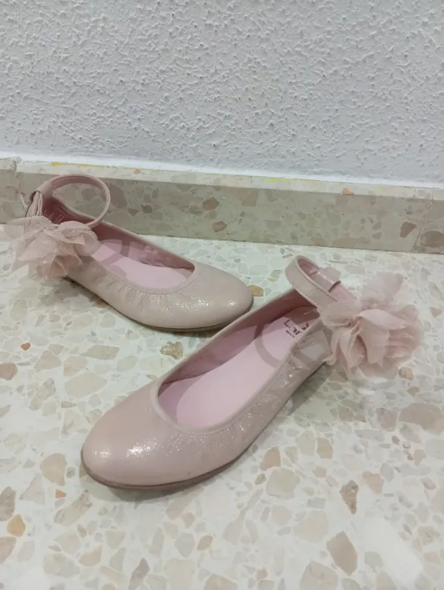 Detalles del productoBailarinas de ceremonia en charol rosa empolvado. Hechos en España. Número 34 (talla pequeño). La pulsera y la flor se pueden quitar.