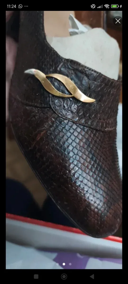 Elegantes zapatos de piel de serpiente con un detalle metálico dorado, zapatos antiguos, cómodos muy bien conservados