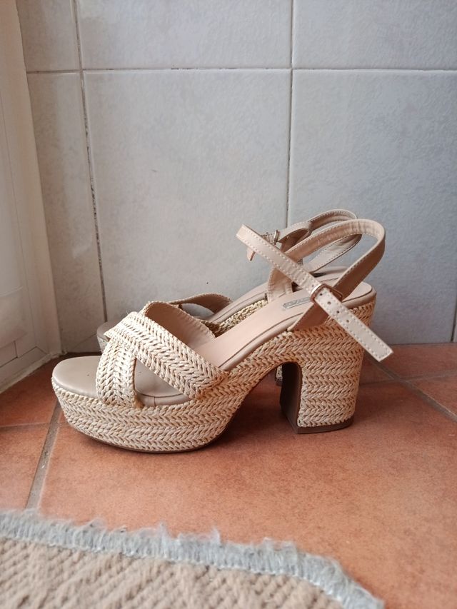 Detalles del productoPreciosos zapatos de plataforma. Son de color beige y están hechos de esparto trenzado. Ideales para verano.