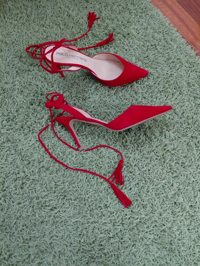 Zapatos rojos de tacón,cordones para atar tobillo.