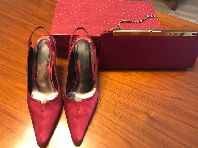 Conjunto de zapatos y bolso de fiesta totalmente a juego, los zapatos fueron forrados con la misma tela del bolso, en satén burdeos (granate tipo cardenalicio), para coordinar a la perfección.