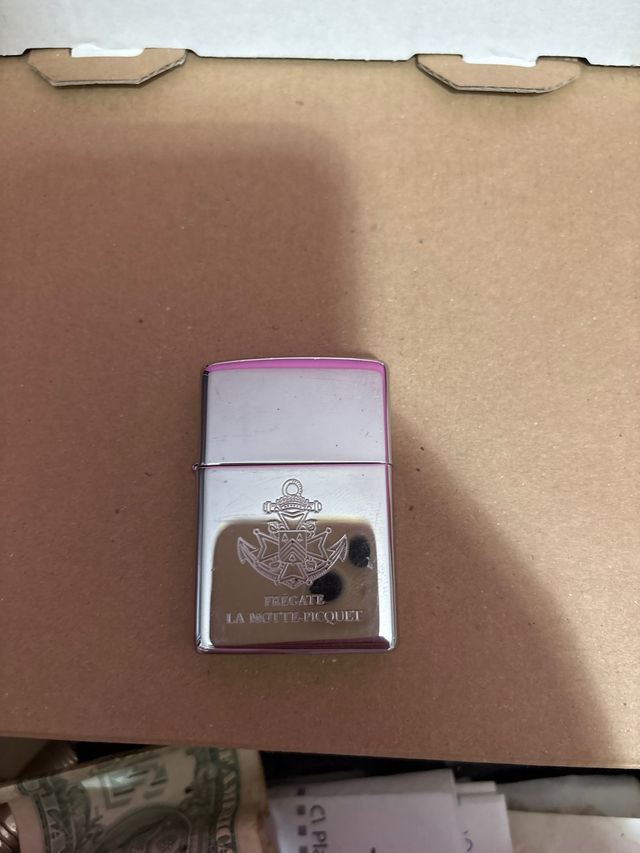 Mechero Zippo plateado con grabado. - Diseño de ancla y escudo. - Inscripción FREGATE LA MOTTE-PICQUET.