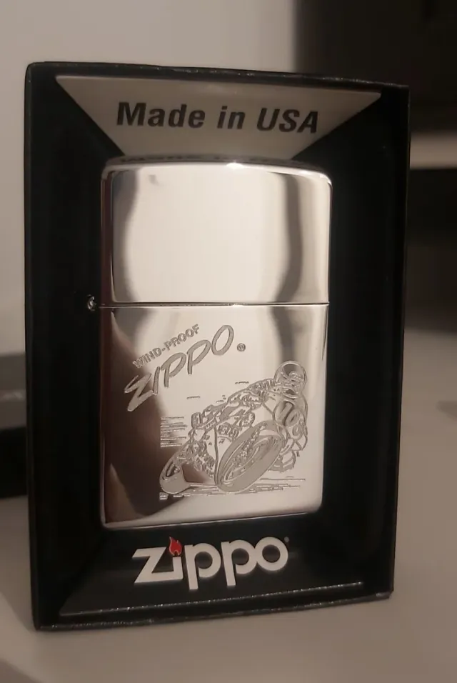 Detalles del productoMechero Zippo con diseño de moto y texto grabado Wind-Proof Zippo, está completamente nuevo a estrenar y sin uso.