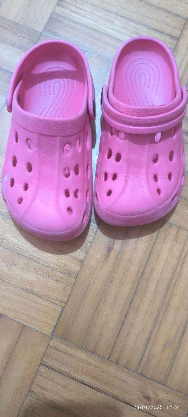 Zuecos tipo sandalia en color rosa, perfectos para niñas. - Diseño abierto con perforaciones. - Tira trasera para mayor sujeción. - Suela con relieve.