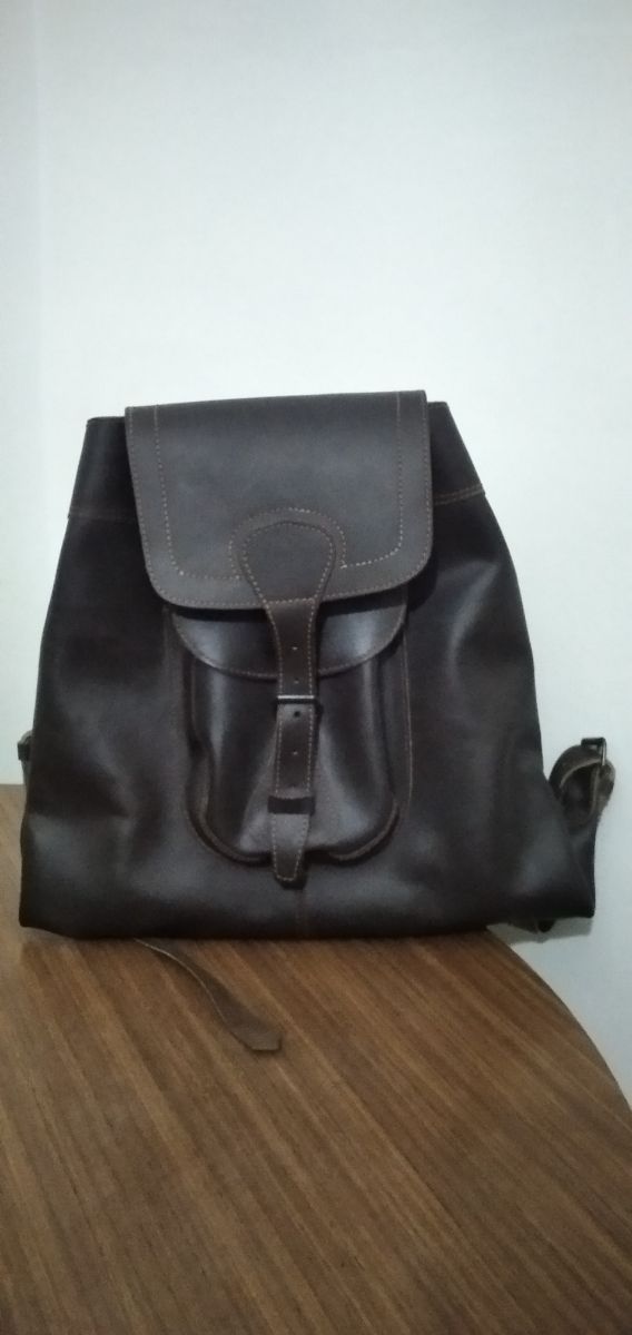 Macuto, mochila, zurrón de caza, monte, naturaleza. De cuero marrón oscuro. Nuevo a estrenar con forro interior, impecable