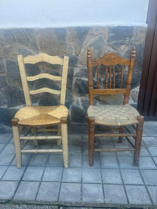 Conjunto de dos sillas antiguas con asientos de yute y estructura de madera. La oscura es de pita y la mas clara enreda en anea . - Asientos tejidos a mano. - Respaldo curvo con diseño de tres barras. - Patas robustas con travesaños de soporte.