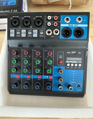 Mezclador de audio profesional con múltiples entradas y salidas. - Entradas: 3 x Mic/Línea, REC L/R, CD L/R, Main Out L/R. - Controles: Gain, High, Low, Eff, Peak por canal. - Funciones adicionales: PAD, HPF, +48V Phantom Power, Delay, Repeat. - Conectividad: USB para reproducción MP3. - Salida de auriculares.