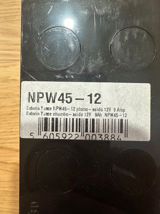 Batería de plomo-ácido regulada por válvula.La vendo por que la comore y no me sirve y no puede devolverla - Marca: Yuasa - Modelo: NPW45-12 - Voltaje: 12V - Capacidad: 45W/Celda, 10min. - Diseño: No derramable, diseñado para uso en espera.