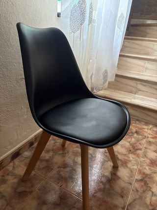 Conjunto de cuatro sillas de comedor con un diseño escandinavo moderno. Están en buen estado y han tenido poco uso. - Asiento acolchado para mayor comodidad. - Patas de madera maciza para estabilidad.