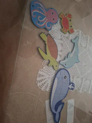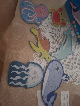 Set de puzzles con temática de animales marinos. Incluye un pulpo, un cangrejo, una tortuga, un delfín, una medusa y una ballena. - Diseños coloridos y educativos. - Fomenta la motricidad fina y el reconocimiento de animales.