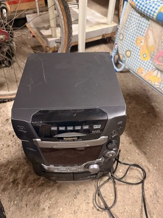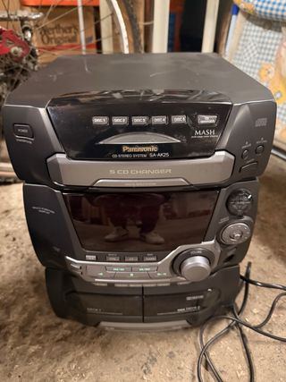 Sistema de sonido Panasonic con cargador de 5 CDs. No se si funciona lo de los cds y casettes. Lo probe con radio y se oye. Tiene varias marcas superficiales. - Modelo: SA-AK25 - Color: Negro y gris - Carga de 5 CDs - Tecnología MASH
