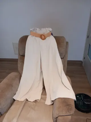Conjunto de mujer de dos piezas en color beige. El top es fruncido y el pantalón es ancho. - Top con escote elástico. - Cinturón de tela con hebilla redonda. - Pantalón de pierna ancha.