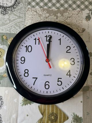 Reloj de pared con diseño moderno y marco negro. - Esfera blanca con números grandes. - Agujas de hora, minuto y segundero. - Mecanismo de cuarzo.
