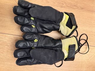 Guantes de esquí Leki en color negro y detalles en amarillo neón. - Marca: Leki - Talla: 5 - Diseño deportivo con protecciones. - Cierre de velcro en la muñeca. La zona de la muñeca está desgastada, el resto es de piel y se encuentra en muy buen estado.
