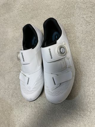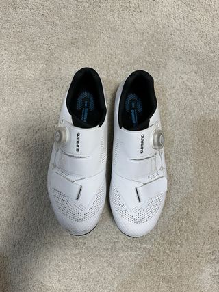 Zapatillas de ciclismo Shimano en color blanco talla 38, tallan justas, de normal uso un 37. - Cierre BOA. - Diseño perforado para ventilación. - Logo de Shimano en la lengüeta y plantilla. - Sin apenas uso.