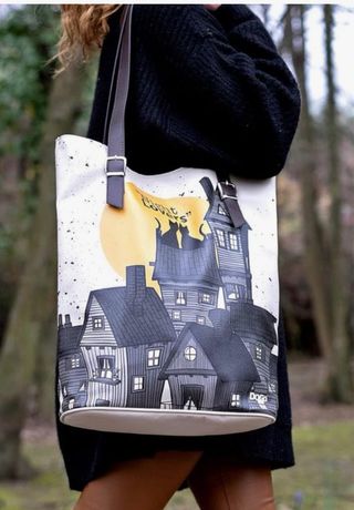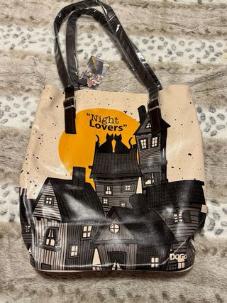 Bolso de mano con un diseño original de Dogo con temática de gatos y casas. - Estampado de casas y gatos bajo la luna. - Cierre con correa. - Asas de cuero sintético.