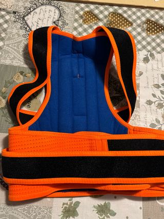 Este corrector de espalda es de color naranja con detalles en negro y azul. - Talla XXL. - Cierre de velcro.