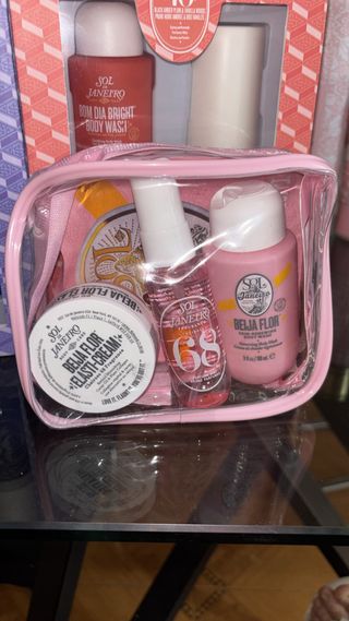 Set de cuidado corporal de Sol de Janeiro. - Incluye gel de ducha Bom Dia Bright. - Incluye crema corporal Beija Flor Elasti-Cream. - Incluye fragancia Beija Flor 68. - Viene en una bolsa transparente con cierre de cremallera.