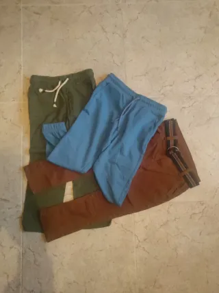 Conjunto de tres pantalones para niño. - Pantalón azul con cordón. - Pantalón verde con cordón. - Pantalón marrón con cinturón.