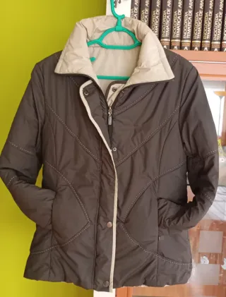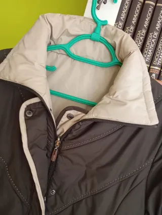 Cazadora plumífero reversible o chaqueta de Invierno acolchada con relleno Moda Woman Fashion. Diseño reversible combinando color marrón chocolate con color beis crema. Cuello alto, cierre de cremallera solapeada con broches a presión. 2 bolsillos delanteros. Talla 44 - Diseño acolchado. - Cuello alto. - Cierre de cremallera y botón. - Bolsillos laterales.