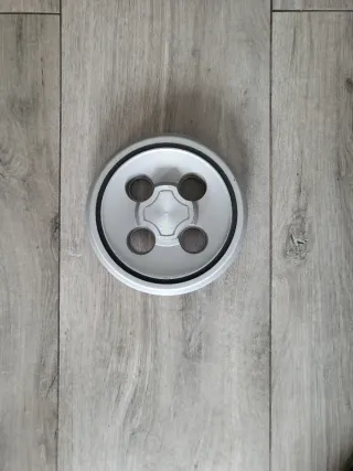 Tapacubos original de la marca Talbot. Pieza de repuesto para vehículos. - Diseño plateado con detalles en negro. - Cuatro orificios centrales.