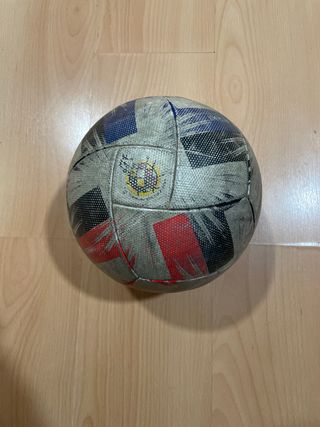 Balón de fútbol con diseño de Union Jack y detalles en rojo y azul. Presenta un escudo central con un diseño circular. - Diseño Union Jack. - Detalles en rojo y azul. - Escudo central.