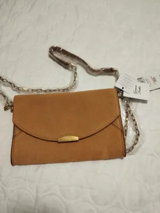 Bolso de piel de la marca Mango, completamente nuevo y con su etiqueta original. - Material: Piel genuina. - Color: Tostado / Camel. - Cierre: Solapa con broche metálico. - Correa: Cadena y piel. - Incluye etiqueta de la marca.